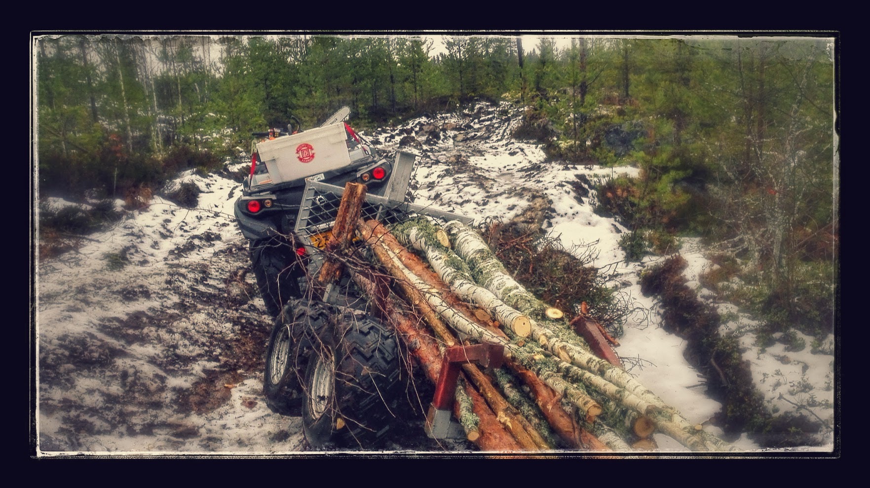 Käytössä mönkijä ja tukkikärry, joka ei vaadi isoja ajouria eikä jätä juurikaan jälkiä metsään tai pihaan. Sillä saadaan kuitenkin vaikeistakin paikoista puut pois helposti.